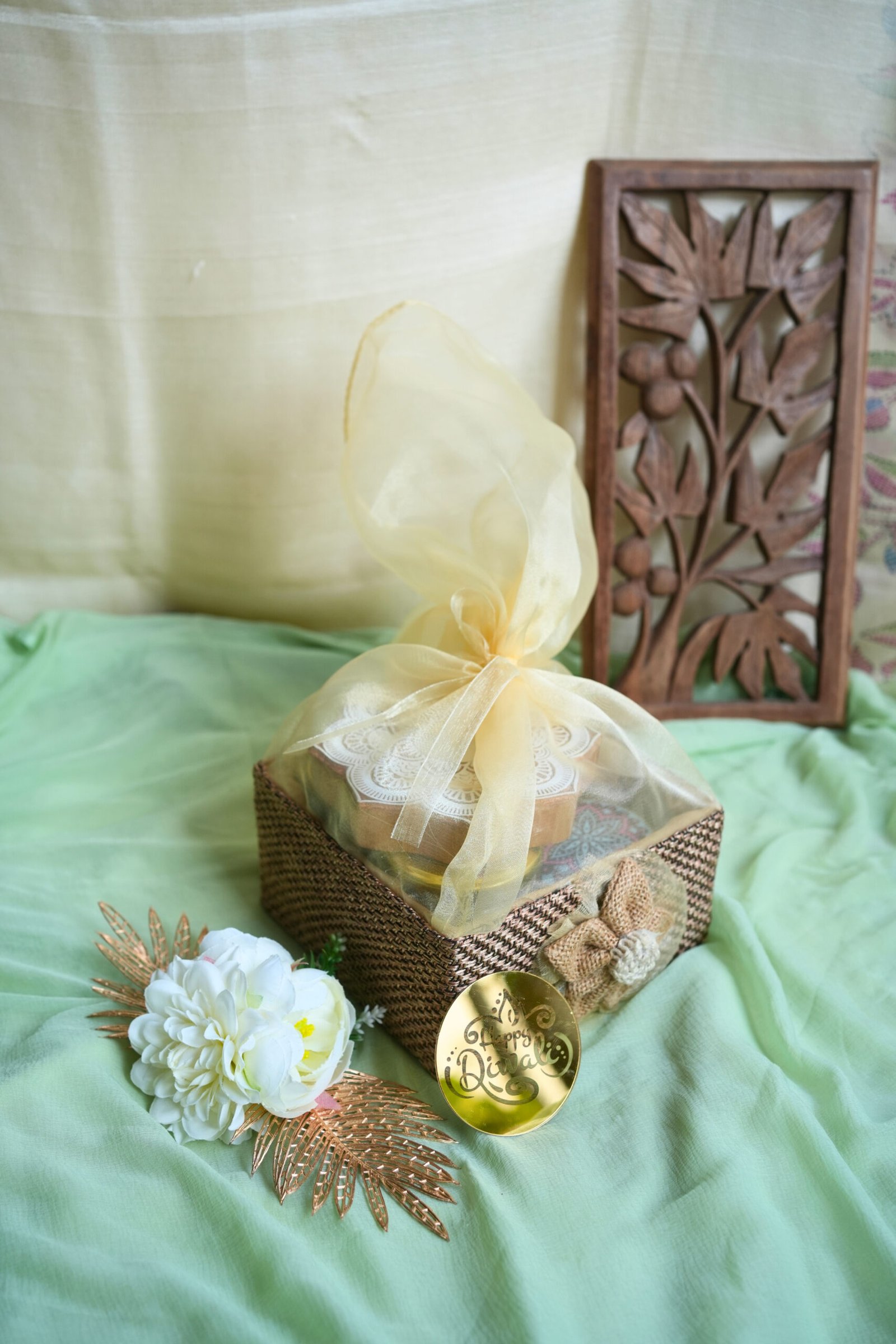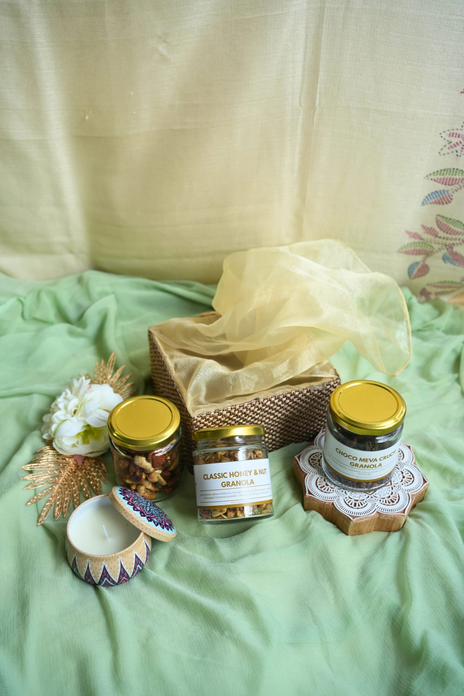 ✨ Festive Add-ons – a scented candle and a handcrafted diya to complete the celebrations.