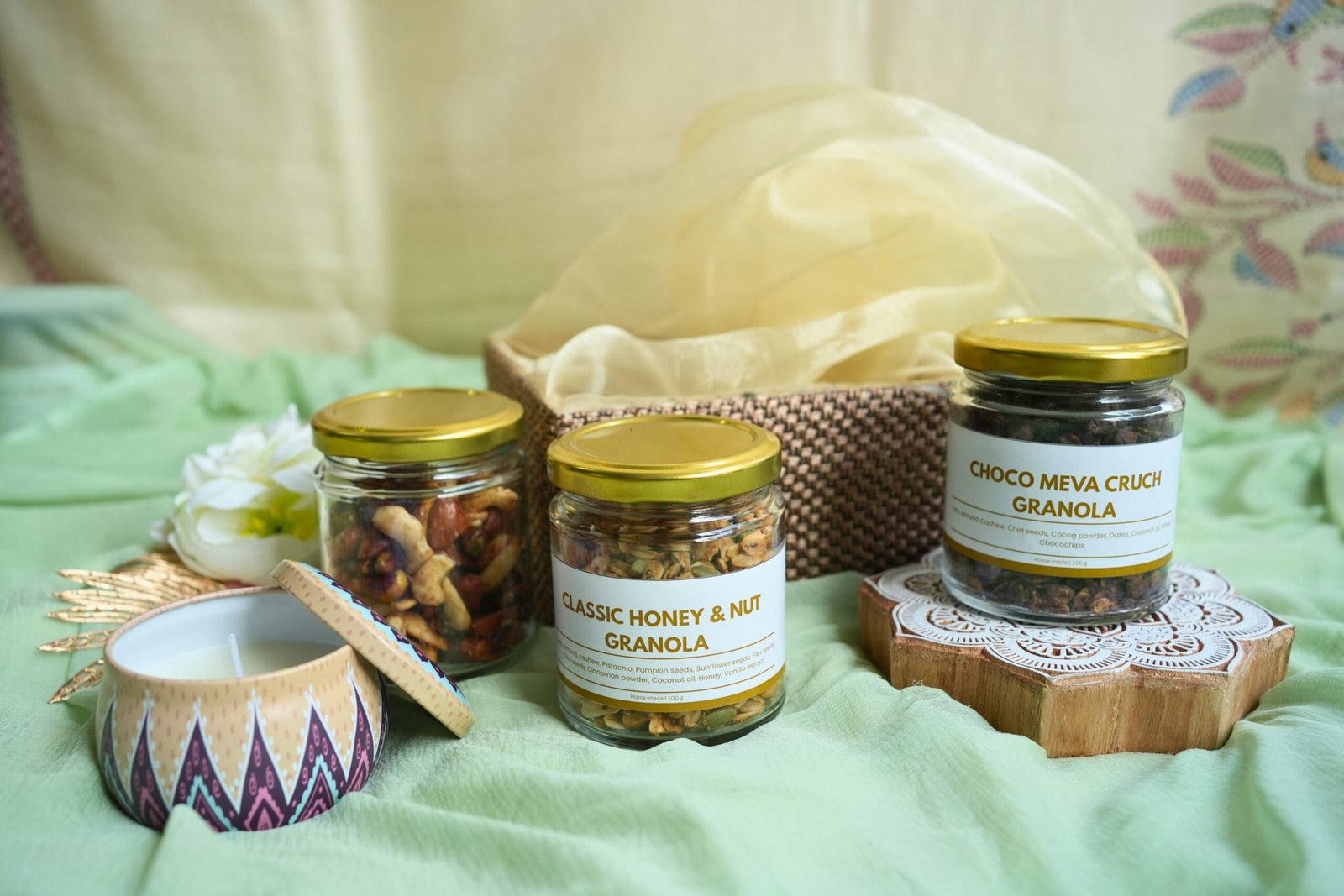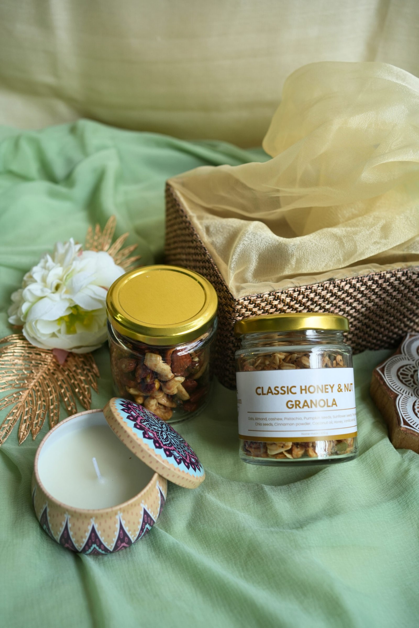 You can also customise your hamper by choosing any two flavours from our granola collection. With its festive glow and gourmet richness, this hamper is ideal for Diwali, family gatherings, and elegant corporate gifting — adding warmth and flavour to every occasion.