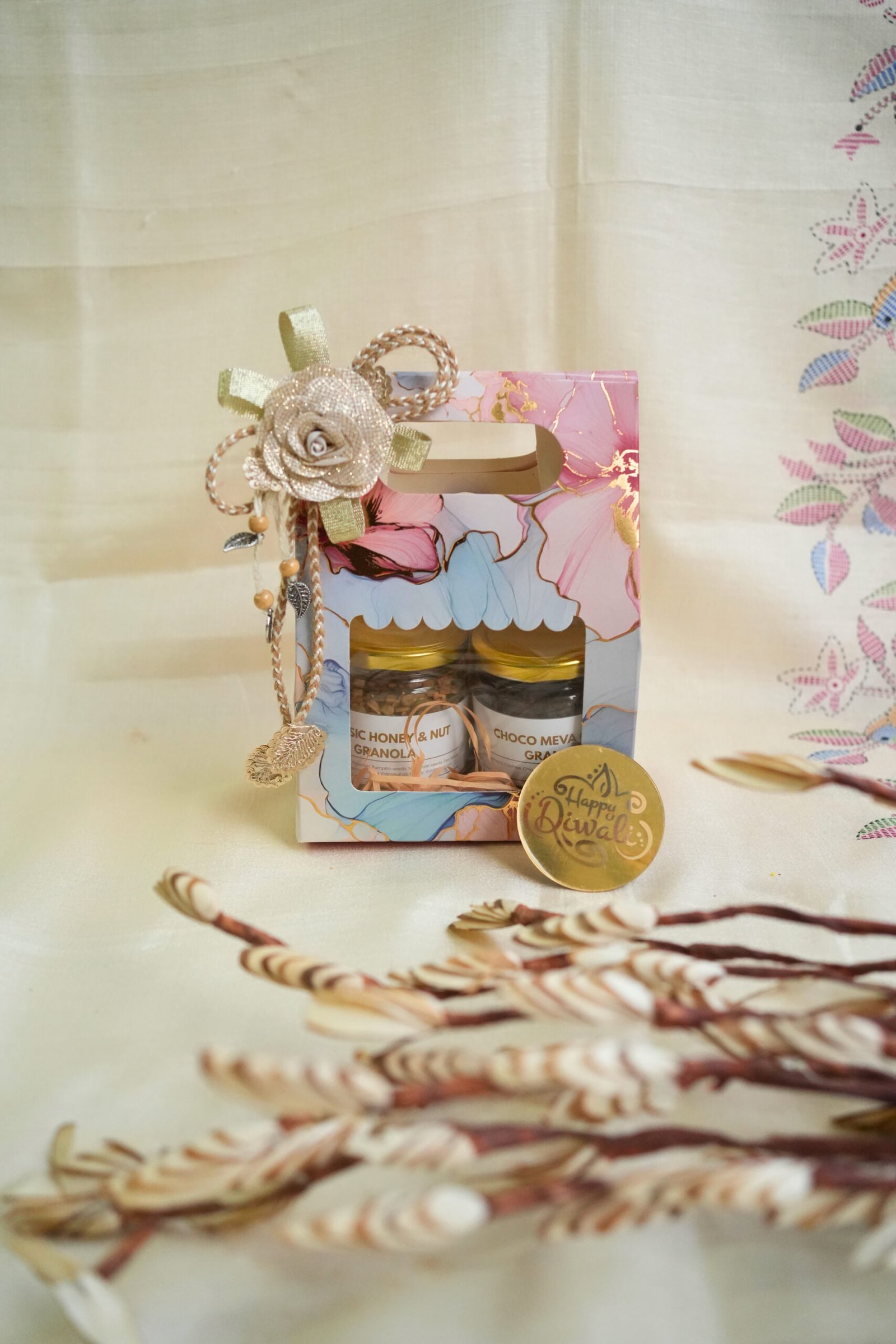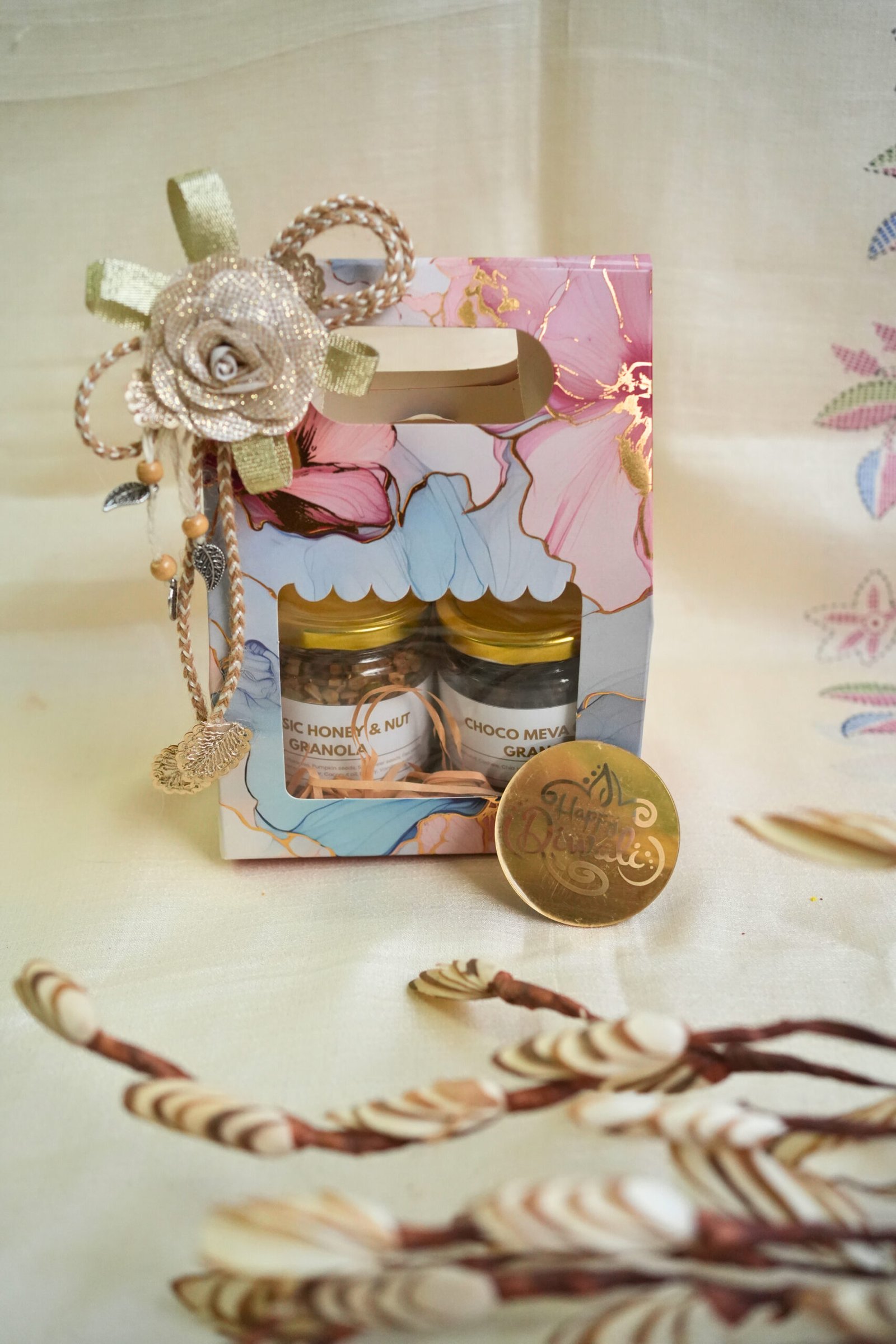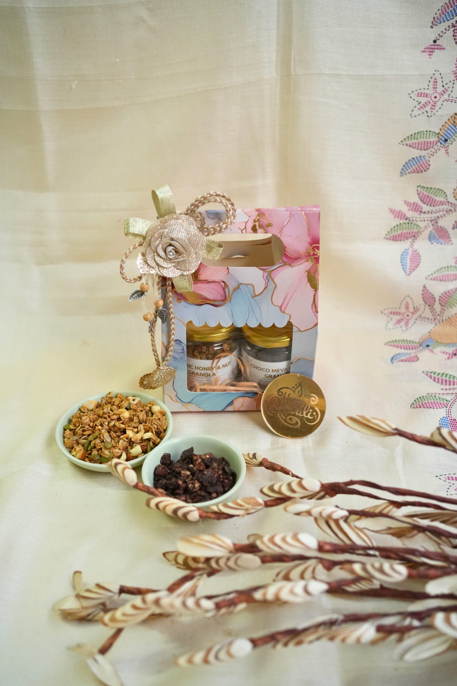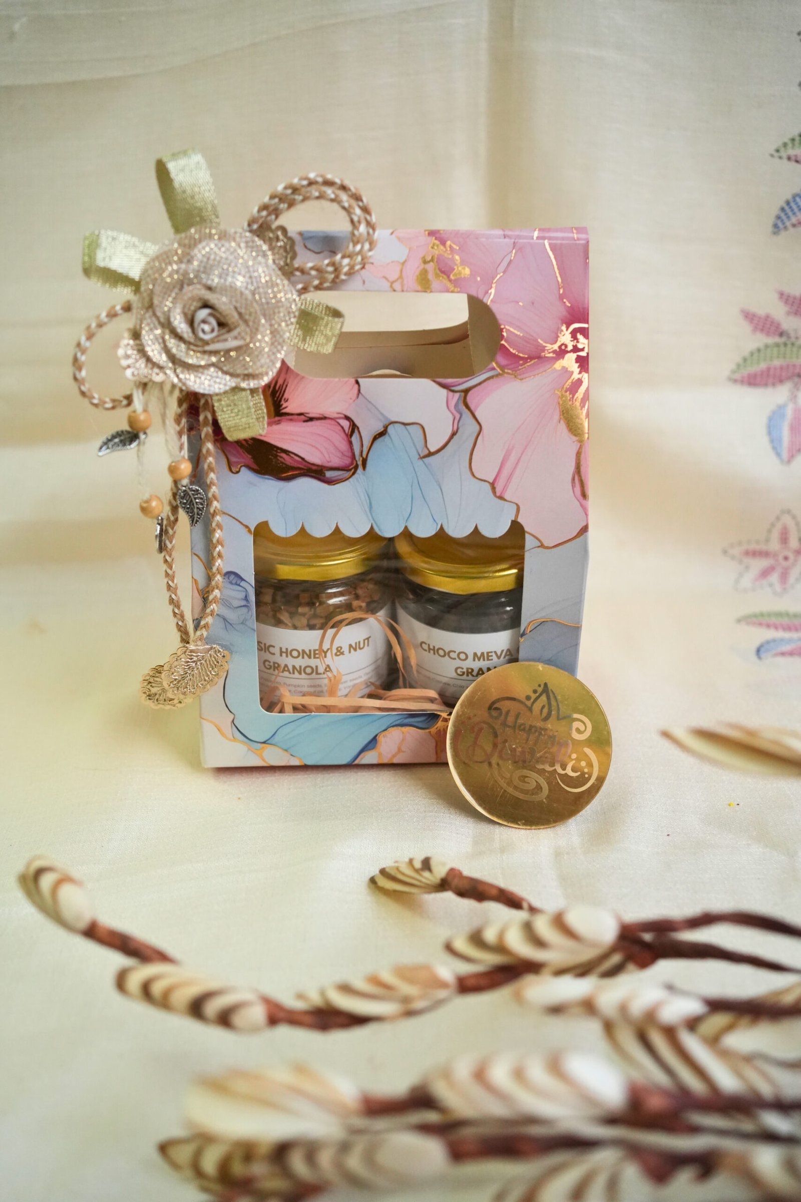 You can also customise your box by choosing any two flavours from our granola collection to create a truly personalised gift. With its charming design and convenient handle, this box makes a perfect gift for birthdays, thank-you gestures, or any moment that calls for a small, thoughtful present.