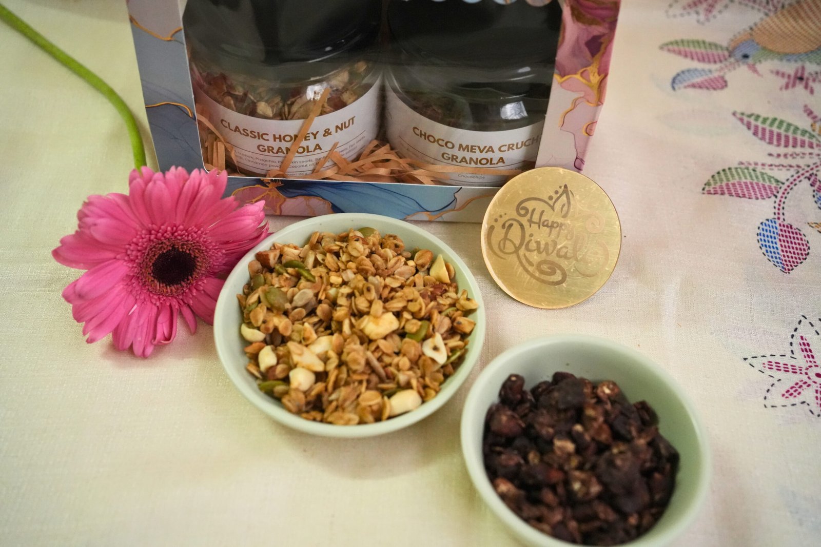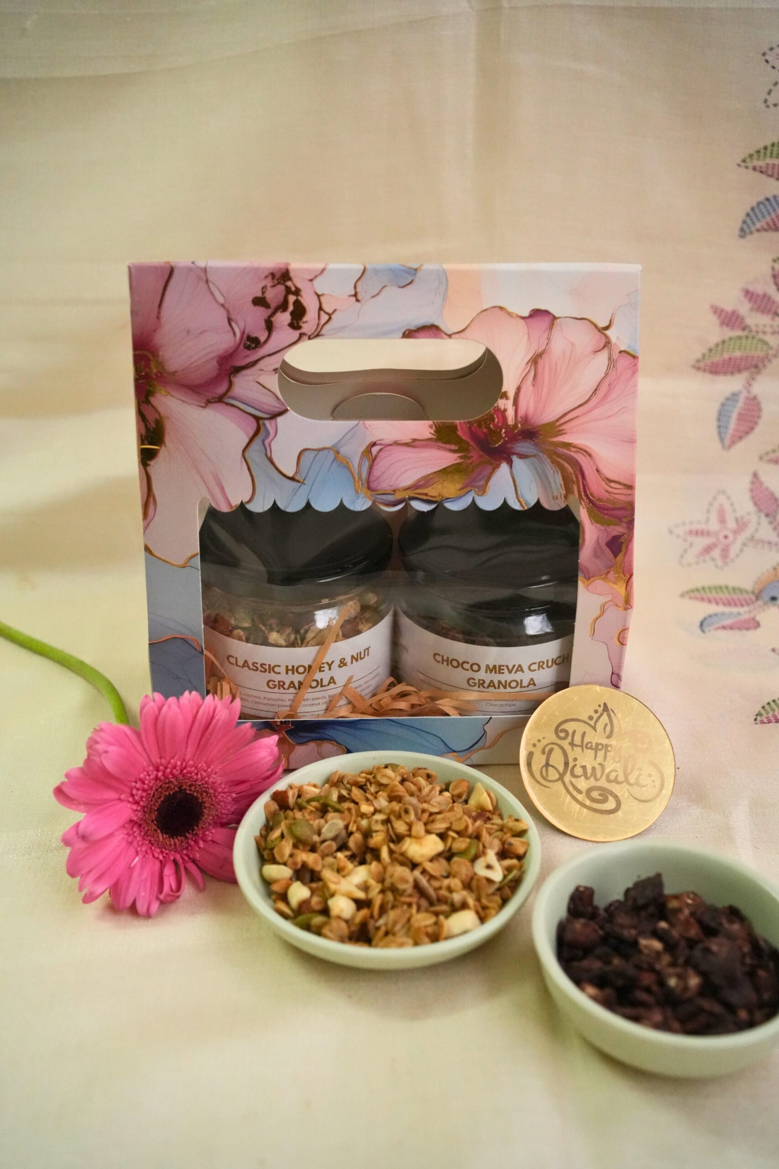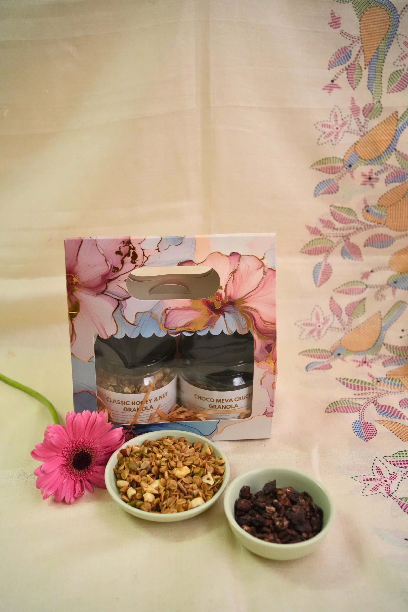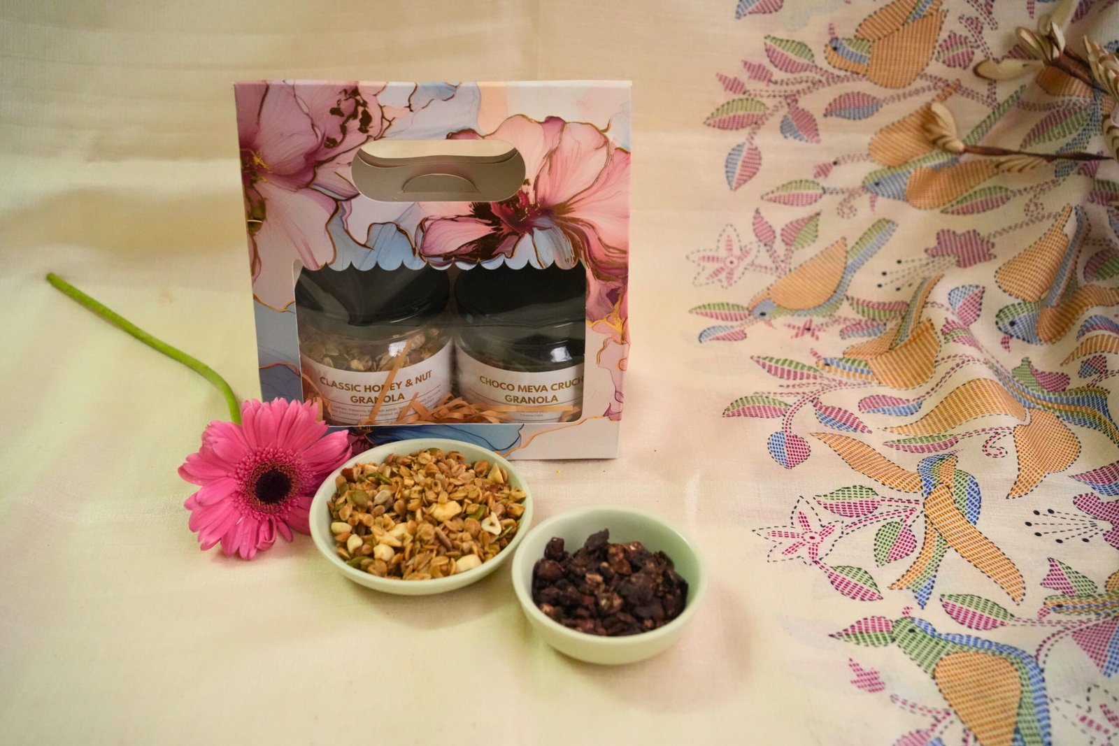 You can also customize your box by choosing any two flavors from our granola collection to create a personalized gift. With its charming floral print and a clear window displaying the delicious treats, this hamper makes a perfect gift for birthdays, thank-you gestures, or any occasion that calls for a truly special and flavourful present.